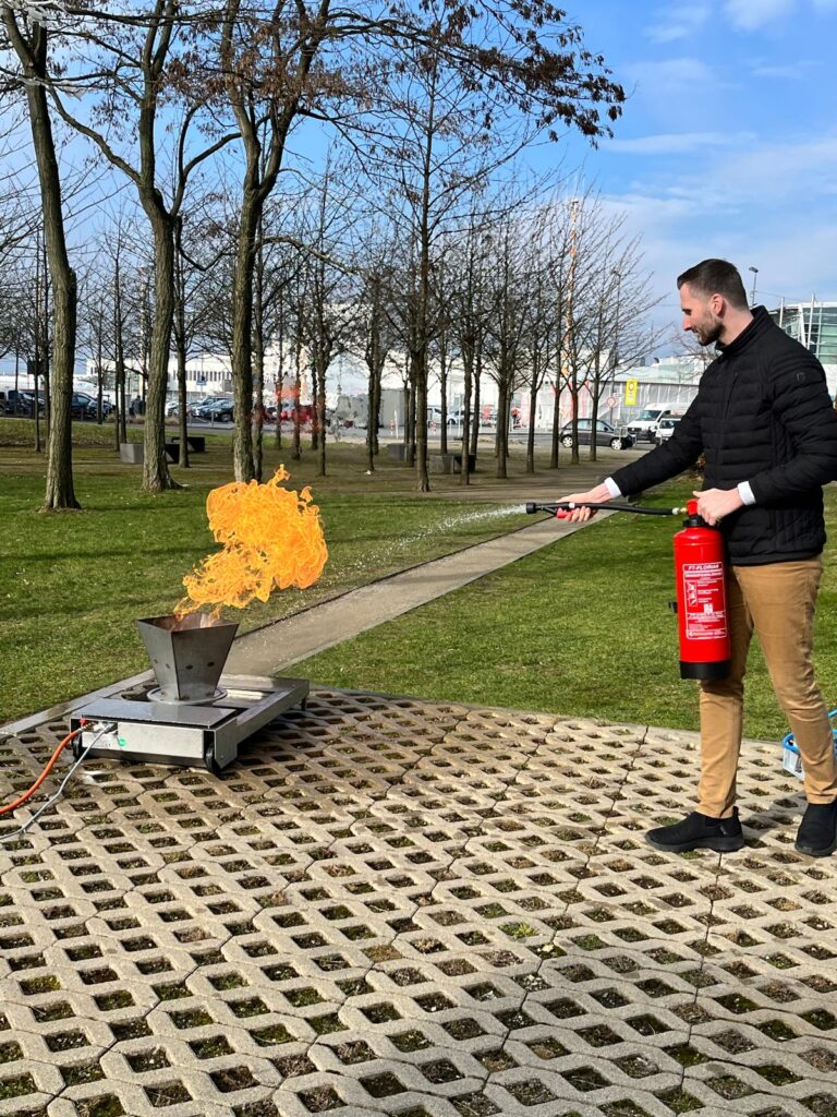 Zum Abschluss ging es nach draußen, wo eine kleine Feuerlöschübung auf dem Programm stand. Hier konnten wir den Umgang mit Feuerlöschern selbst ausprobieren und das Gelernte direkt anwenden.